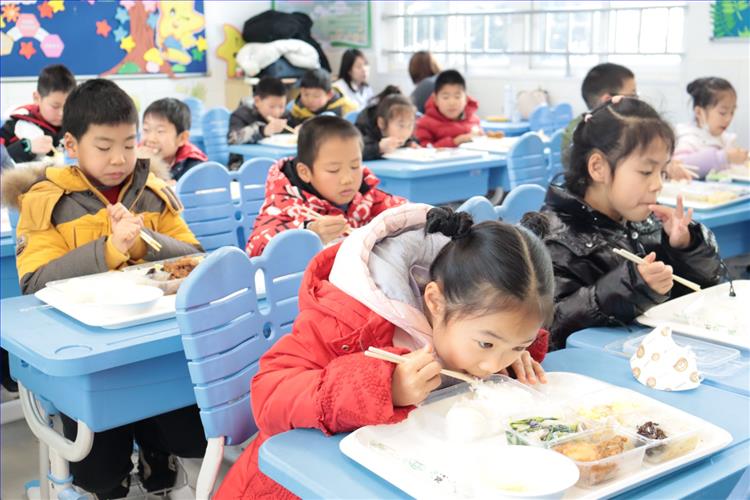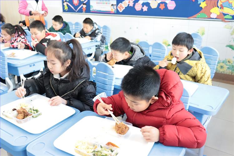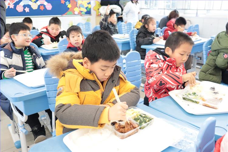 中午,孩子们在老师、志愿者的帮助下完成个人卫生工作;排队洗手,测体温,并安静地在教室就餐。